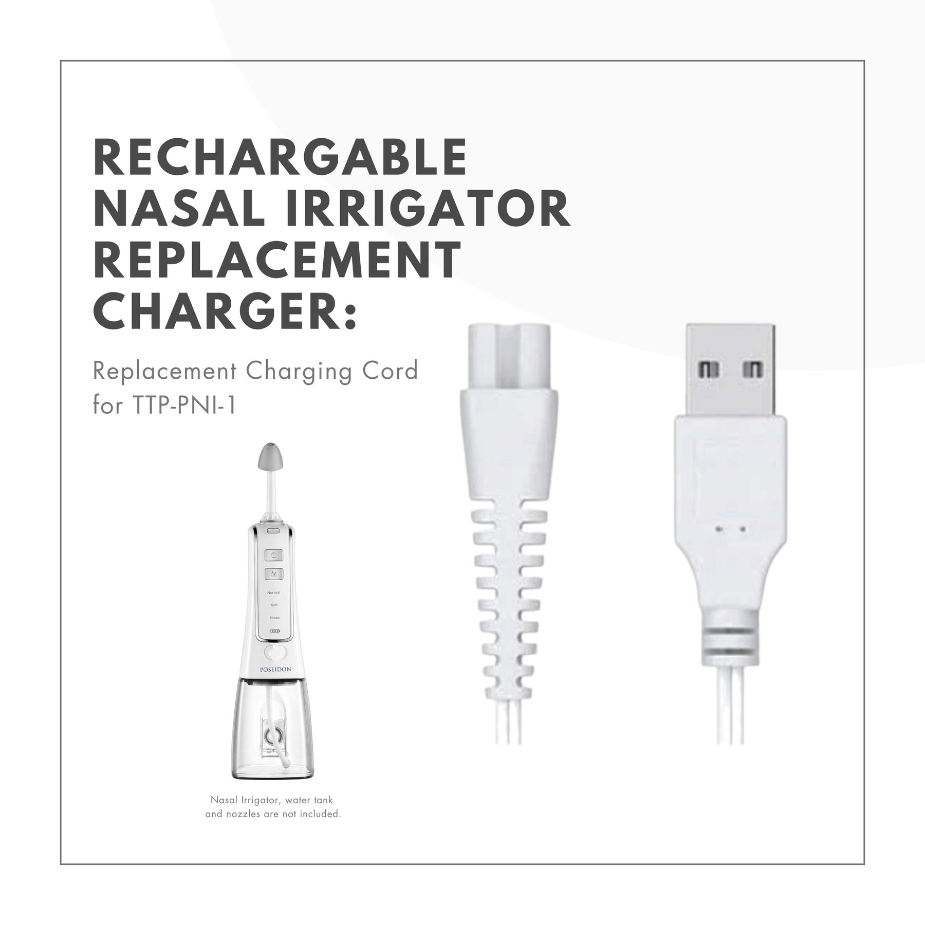 Easily restore charging functionality to your ToiletTree Poseidon Nasal Irrigator with this reliable replacement USB cord. Designed exclusively for our Poseidon model, this high-quality USB charger ensures your nasal irrigator stays powered and ready for daily sinus care routines. Please note a wall charging block is not included.